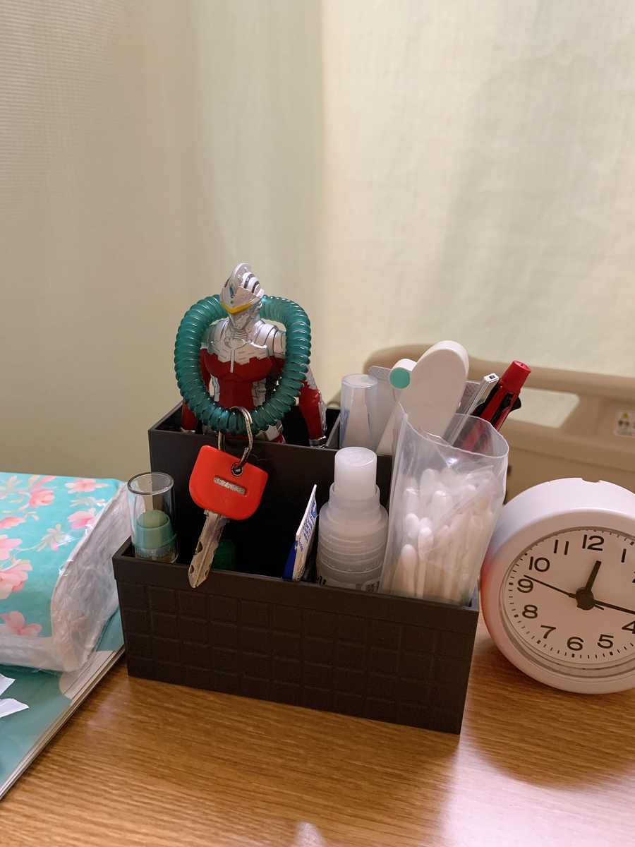 時間がわからないのはしんどいので机に置いていた。日付もわかるデジタル時計派も見たけど、無印の浴室用のアナログ時計を置いた。置くのもフックで掛けられるのもできる上に、秒針の音がしないところがよい。入院終わっても家の浴室で愛用。